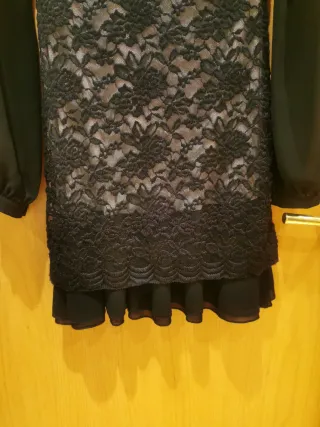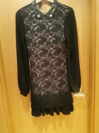Elegante vestido negro con detalles de encaje y cuello de cuero. 1puesta,en buen estado SOLO ENVIO Largo 88,cintura 30 - Mangas largas de gasa. - Cuerpo de encaje floral. - Cuello con tachuelas, y initando a cuero - Falda con volantes.