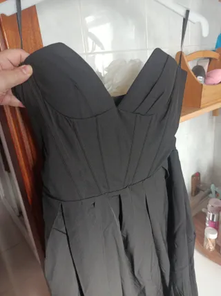Elegante vestido negro de fiesta, ideal para ocasiones especiales. Talla L pero talla pequeño, es para mujeres con la M - Diseño sin mangas. - Tejido con textura. - Falda con pliegues.