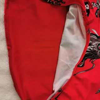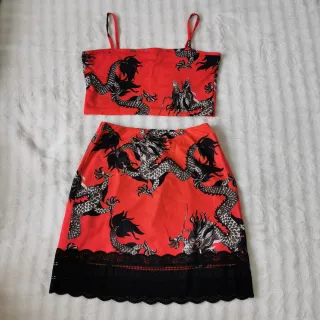 Conjunto de dos piezas con estampado de dragones. Talla S/M - Top con tirantes finos, lo arreglé poniendo otra tela roja en el pecho para no transparentar. - Falda con detalle de encaje negro en el bajo puestos por mi