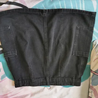 Falda vaquera de corte recto con detalles de cargo y cremallera frontal. - Cremallera metálica dorada. - Dos bolsillos de cargo en los laterales.