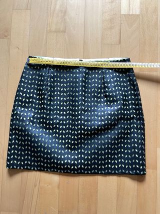 Falda de cadera color negro con microdibujo en amarillo limón . Con forro. 54% rayón viscosa , 46% poliéster. Largo 41 cm.