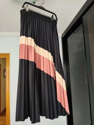 Falda larga plisada con un diseño de bloques de color. Talla única. Con etiqueta. Nueva, a estrenar. Cintura de goma ancha, por lo que se adapta a diferentes tallas. - Diseño plisado. - Detalle de franjas diagonales de diferentes tonos
