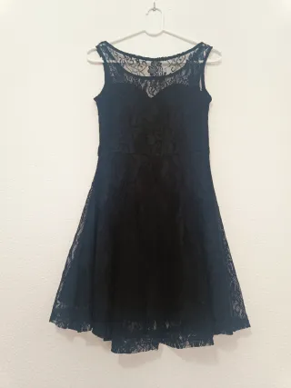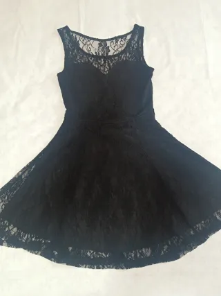 Vestido corto negro con tirantes finos. La parte superior tiene un diseño con líneas brillantes que queda muy elegante y favorecedor. La falda es fluida y ligera. Ideal para eventos, cenas de navidad o año nuevo. En muy buen estado.