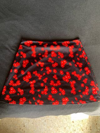 Falda corta con un llamativo estampado de flores rojas sobre fondo negro. - Diseño floral. - Corte acampanado.