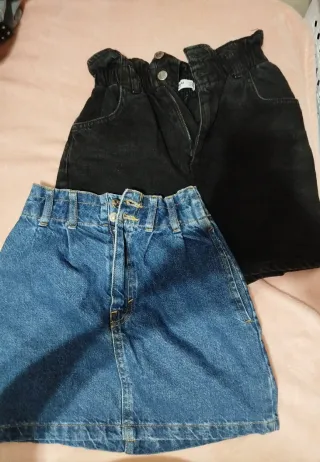 Dos faldas vaqueras de diferentes tonos. Una es de color azul y la otra negra. Puedo Venderlas por separado o juntas. - Cintura alta. - Diseño moderno.
