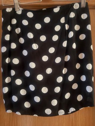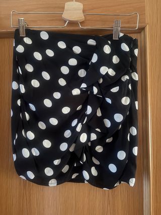 Falda corta con estampado de lunares blancos sobre fondo negro. Presenta un diseño drapeado y cruzado en la parte delantera. -Cierra cremallera lateral - Tejido ligero. - Detalle fruncido. - Estilo moderno.