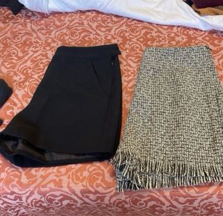 Conjunto de falda pantalón negra y falda de tweed con flecos. - Falda pantalón de color negro. - Falda de tweed con diseño de tejido y flecos en el bajo. Lote de dos prendas 5 euros