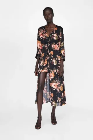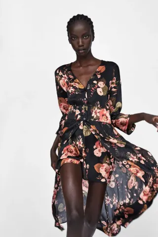 Vestido pantalón de Zara con estampado floral. - Diseño con escote en V. - Cintura marcada. - Falda con abertura frontal.