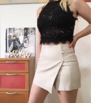 Falda pantalon Zara, color beige efecto piel, detalle de abertura con cremallera plateada en la parte posterior y cremallera en la parte posterior. Talla XS. Usada 2 veces. Composicion 100% Poliester Medidas Cintura 33 cm Cadera 41 cm Largo 35 cm