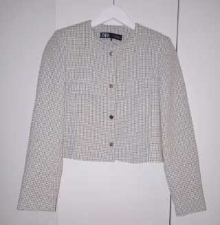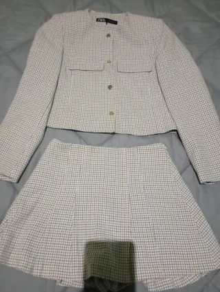 Conjunto de dos piezas de Zara, compuesto por una americana y una falda pantalón. - Americana con cuello redondo y cierre de botones. - Dos bolsillos de solapa en la parte delantera de la americana. - Falda pantalón con vuelo y pinzas.