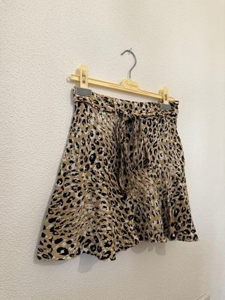 Falda pantalón con un llamativo estampado de leopardo. - Diseño con cinturón anudado. - Corte acampanado.