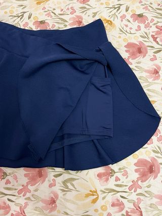 Falda pantalón deportiva de color azul. - Diseño cruzado en la cintura. - Corte acampanado. - Tejido con textura. - La malla tiene bolsillo Usada un par de veces. La vendo porque me está grande.
