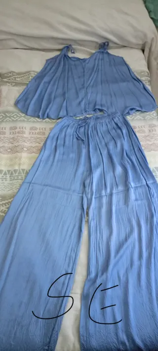 Elegante conjunto de tres piezas para ocasiones especiales. Verde mar. Talla 50. Poliester. Comprado en tienda d novias. Puesto una vez. NO tengo foto d cuerpo entero. El pantalón, al ser gasa, es muy airoso. - Chaqueta de gasa con mangas acampanadas. - Top con detalle de pedrería y escote redondo. Pantalón ancho, doble capa, abierto a los costados