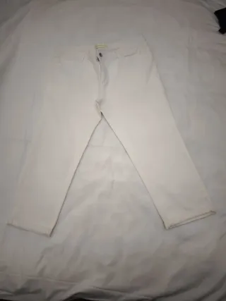 Pantalón vaquero de color blanco de la marca Encuentro. - Corte recto. - Cierre de cremallera y botón. - Bolsillos delanteros y traseros. - precio 8€ Blusa gasa estampado hojas, azul turquesa con forro. Talla única. Precio 8€. Conjunto pantalón y top Blusa a 15€ con regalo de falda lino MIDI blanca.