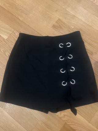 Falda pantalón de color negro con un diseño moderno. Lo vendo porque ahora me queda grande - Detalle de ojales metálicos en la parte delantera. - Corte asimétrico. - Tejido cómodo.