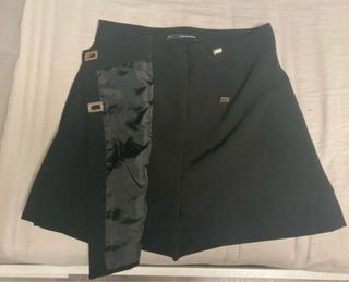 Falda pantalón de color negro, talla L. Diseño moderno con detalle de hebillas. - Detalle de hebillas plateadas en el lateral. - Bolsillo trasero. - Diseño tipo falda con short interior.