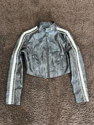 🔥 Estilo racing / Y2K ⚡ Corte cropped que estiliza 🖤 Cremalleras metálicas delanteras + bolsillos con zip 🏁 Franjas blancas deportivas en mangas 💎 Acabado efecto cuero envejecido con brillo sutil 📏 Talla S 📐 Medidas: 43 cm ancho x 46 cm largo ✔️ Estado muy bueno Queda espectacular con jeans de tiro alto, pantalón cargo o mini falda.