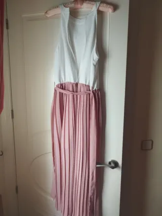 Mono pantalón elegante con top blanco y falda plisada en tono rosa.Cuerpo blanco con sisa metida 44 cmts sisa a sisa y pantalón en gasa plisada color rosa, abrocha con cremallera por detrás,con cinturón en trabillas. Largo total 122 cmts . - Diseño halter. - Cintura elástica. - Piernas anchas.