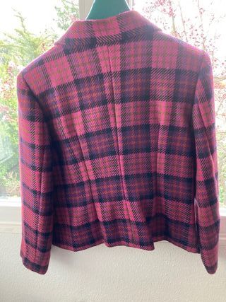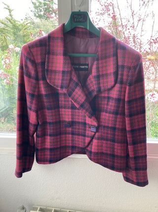 Elegante chaqueta de alta costura del taller del modisto Vicente Prieto, Madrid, años 1990's. Talla 42-44 aproximadamente, comprobar las medidas. En colores morado, fucsia y negro. Confeccionada en lana 100% con hombros marcados. Queda perfecta con falda o pantalón azul marino o negro o con vaqueros para un atuendo más informal. Estado impecable. Medidas: hombros: 42cm; axila-axila: 49cm; largo (espalda): 53cm; largo de manga: 56cm. - Diseño de cuadros en tonos fucsia, morado y negro. - Cuello solapa clásico. - Cierre de doble botón. - Forro interior a tono.