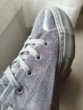 Zapatillas de terciopelo en color gris. Muy cómodas, quedan genial con faldas largas y pantalones de campana. Prácticamente nuevas. - Material exterior de terciopelo suave. - Cordones a juego. - Suela de goma.