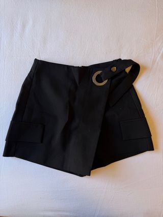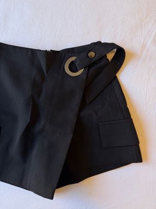Falda pantalón de color negro con un diseño moderno y detalles únicos. Diseño cruzado. Detalle de anilla metálica y cinturón. Bolsillos de parche en los laterales.