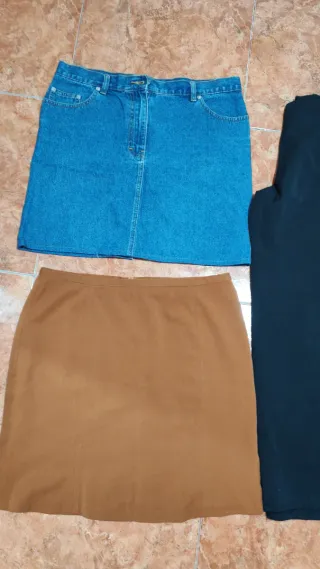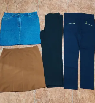 Conjunto de ropa para mujer. - Falda vaquera. - Falda marrón. - Pantalón negro de pinza - Pantalones azul marino con cremalleras. Todo 10