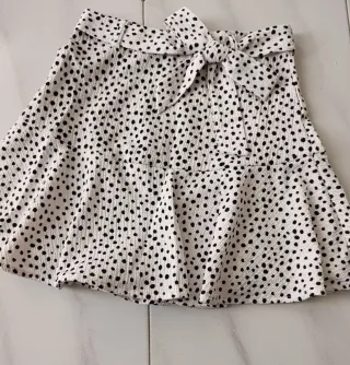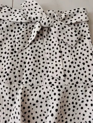 Falda pantalón de Zara con estampado de lunares. - Diseño con lazada. - Estampado de lunares blancos sobre fondo negro.