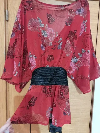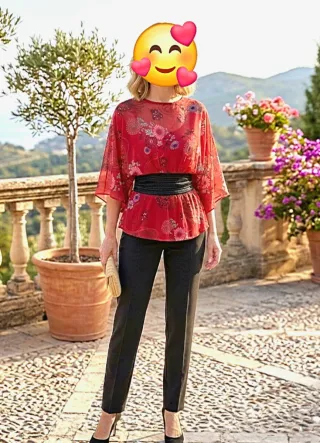 Preciosa blusa de gasa semitransparente en color rojo vibrante con un delicado estampado floral de inspiración japonesa. Es una prenda muy especial que estiliza muchísimo gracias a su diseño. Incluye un fajín ancho en satén negro que marca la cintura y realza la silueta. Tiene un amplio escote por detrás que se cierra con una lazada.Queda increíble tanto con pantalones de vestir negros o falda tubo para un evento boda, comunión, cena, como con jeans para un look más chic de