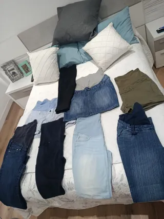 Conjunto de ropa premamá en talla 42. - 2 Pantalones vaqueros azules - Pantalones vaqueros claros. - Pantalones negros. - Pantalones cortos de tela azul claro. - Pantalones cortos de tela verde militar. - Falda vaquera. -pantalon pirata negro