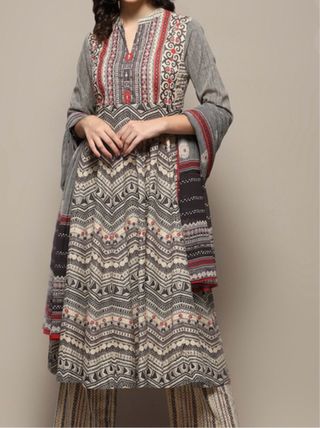 Traje con un diseño estampado. - Mangas tres cuartos. - Cuello mao. - Largo hasta los tobillos. - Estampado geométrico y floral. largo de cuerpo 34 largo de falda 87 mitad de sisa 48