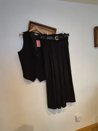 Conjunto de dos piezas formado por un chaleco y un pantalón. - Chaleco con botones. - Pantalón Conjunto de 2 piezas tono negro Muy bonito lleva falda pantalon. y chaleco. Nuevo con etiquetas de la marca Utopía Talla desde una 44 a la 48. Por 17 euros todo. No se rebaja ya esta muy rebajado. Precio final 17 euros.