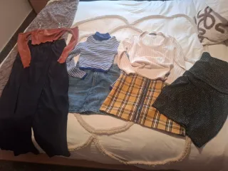 Pack de varias prendas de ropa. Varias marcas - Conjunto de top y pantalón palazzo. - Jersey de rayas azules y blancas. -Falda corta vaquera - Jersey de canalé color crema. - Falda de cuadros amarillos. - Falda y top negra brillante.