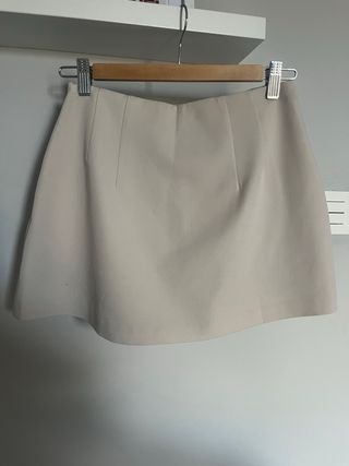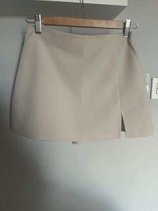 Falda pantalón de efecto piel en color beige. Es una prenda versátil y moderna. - Diseño tipo falda con shorts integrados. - Acabado liso y elegante.