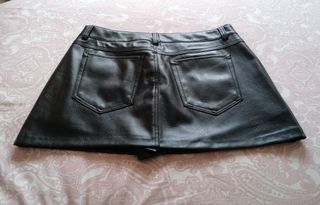 Falda pantalón con diseño de lazo y efecto piel. Talla 34 - Detalle de lazo en la cintura. - Acabado imitación cuero. Es de tiro medio e ideal para ir arreglada en invierno. La vendo porque me queda grande y no la he utilizado, está nueva.