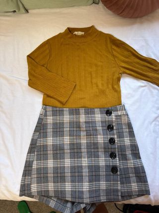 es una falda pantalon de cuadros de color crema y beige, de talla XS, de stradivarius, solo me lo he puesto una vez. queda muy bonito puesto