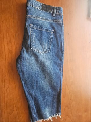 Shorts vaqueros de color azul, con detalles desgastados y adornos metálicos. Son de tiro medio y tienen un corte clásico. - Tienen un diseño desgastado que le da un toque moderno. - Incluyen detalles de tachuelas metálicas en un lateral. - El bajo está deshilachado.cada uno 2€