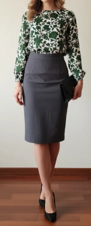 Blusa de manga larga ligeramente abullonada con un elegante estampado floral en color verde bosque sobre fondo blanco. Es una prenda muy versátil, ideal tanto para un look de oficina como para un evento más formal. Detalles: Cuello redondo y cierre trasero con un pequeño botón que crea una abertura discreta en la espalda.Queda ideal con pantalones de vestir o faldas de tubo.