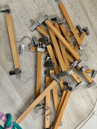 Lote de 20 perchas de madera con clips metálicos. - Ideales para colgar pantalones, faldas o prendas delicadas. - Diseño clásico y funcional.