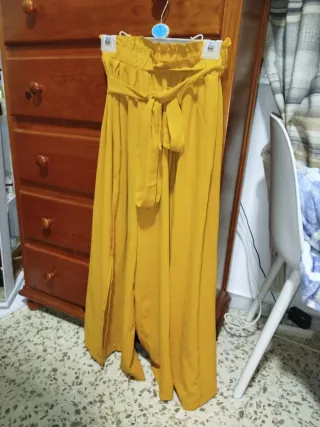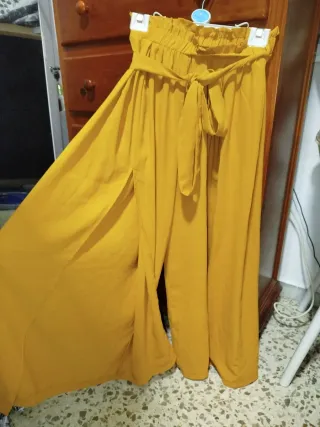 Pantalón ancho de color mostaza con efecto falda y abertura lateral. - Cintura elástica con cinturón. - Diseño fluido y vaporoso. - Estilo palazzo con raja.