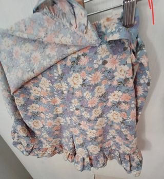 Preciosa blusa y falda corta con pantalon interior de la marca Brownie, talla M. Es de color lila y rosa, con estampado floral. - Mangas con volantes y cuello redondo - Falda con volantes y goma trasera - Tejido ligero y fluido.