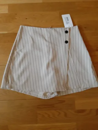 Falda pantalón de estilo moderno con un diseño de rayas verticales. - Diseño de rayas verticales. - Dos botones decorativos en la parte frontal. - Tejido ligero y cómodo ,se abrocha por detrás con cremallera y está nueva con la etiqueta.