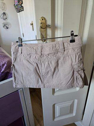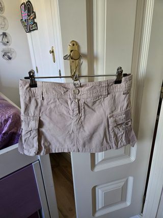 Esta en perfecto estado, ya que solo se ha usado una vez. Es una minifalda cargo con bolsillos a los lados, de tiro bajo y corta. Es de pull and bear, talla s y sienta genial.