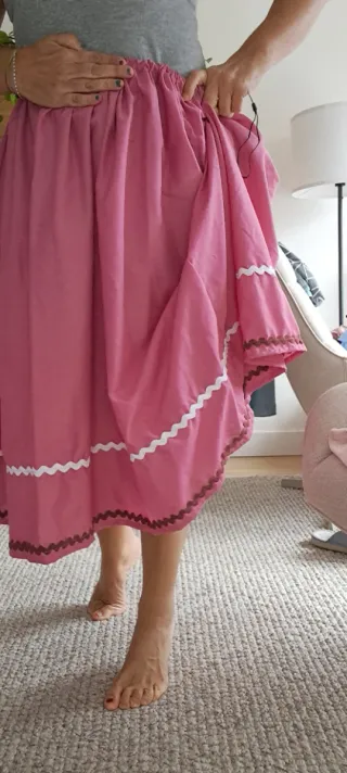 Largo 74cm Vuelo 260 cm TAlla sirve dese 12-13 años S a L o XXL, ya que la cintura se ajusta con goma. Lo importante es mirar tu altura y el largo de falda que necesitas. Hecho a mano por mi ama para las de casa. Etxean eta mimoz egindako baserritar jantziak Usado muy poco, buen estado. FALDA algodón rosa chicle, con piquillo granate y blanco #olentzero #euskaljaia #casera #baserritarra #huertana #caserita #baturra #regional #aldeana #huertana #neska #serrana #pasiega #espigadora #dantza # danza #campesina #pasiega #piñorra #mercau