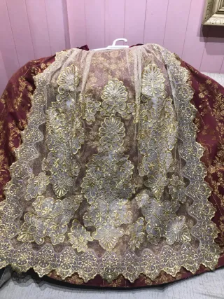 Traje regional de fallera para alquiler. Un diseño elegante y tradicional. 150 € un día, 300€ del 15 al 19 de marzo. Se pide fianza de 200€ y fotocopia del dni. Incluye can can y zapatos talla 38. Se puede probar sin compromiso. - Cuerpo de seda en tono burdeos. - Falda con encaje dorado y detalles florales. - Cuello y puños de encaje blanco. - Lazos decorativos en la cintura.