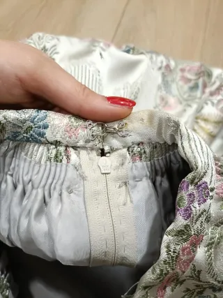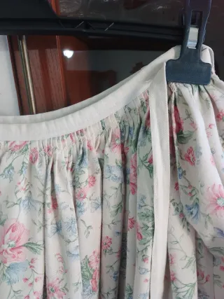 Falda hortelana valenciana brocada mujer talla pequeña Falda tradicional de hortelana valenciana para mujer adulta, ideal para traje regional, fallas, fiestas populares o indumentaria tradicional. Confeccionada en tejido brocado floral de fondo claro con forro interior. Tiene buen vuelo y caída. Cierre trasero con cremallera y corchete metálico, con parte de la cintura elástica para mayor comodidad. Medidas en plano: cintura 30 cm, largo 71 cm, vuelo 280 cm. En buen estado, con signos normales de uso en prenda tradicional.