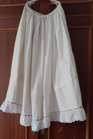Enaguas blancas de traje regional hechas de algodón. Se atan con una cinta por detrás. Restos de vestuario de un teatro. Largo: 92 cm, ancho máximo de la cintura: 178 cl, ancho de la falda: 392 cm. muy buen estado. Hecho a mano, no tienen marca, pero Wallapop me obliga mencionar alguna.