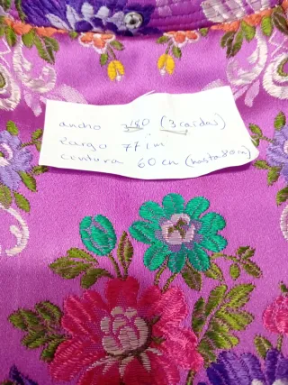 Falda fallera ,largo 98 cm.Cintura 62 cm al maximo Actual ! Tanto de confección como de tejido. Tiene varios corchetes para la cintura.Tiene más tela para sacar de largo. Y cintura extra,por si necesitas sacar del flunce de la cintura unos centímetros.(12) - Diseño con motivos florales en tonos rosas, naranjas, morados y azules. - Tejido con brillo y caída. - Ideal para trajes regionales.