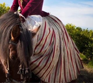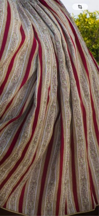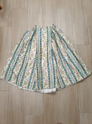 Falda tradicional valenciana de estilo fallera u hortelana, confeccionada en tejido brocado con rayas florales clásicas en tonos beige, azul y rosa. Destaca por su gran vuelo y por llevar forro o enagua blanca incorporada, que aporta volumen sin necesidad de cancán adicional. Ideal para traje de fallera, hortelana, recreaciones históricas, actos tradicionales valencianos, teatro, danza o indumentaria regional. Prenda vintage de segunda mano, con signos normales del uso y del paso del tiempo (ver fotos), pero en buen estado general y lista para usar o ajustar. Medidas en plano: cintura 30–32 cm, largo 89 cm. Vuelo : 310 cm
