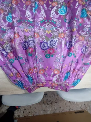 Preciosa tela para traje de fallera o regional con un diseño floral bordado. - Motivos florales en tonos morados y verdes. - Tejido con textura y brillo. - Ideal para confección de indumentaria tradicional. 3 caidas ya cortadas para la falda mas un retal de 1'80×1'40 para corpiño