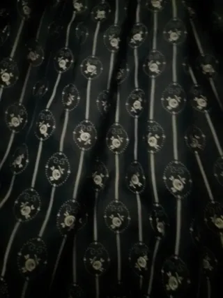 Preciosa tela para falda regional de niña, con un diseño elegante en tonos negros y plateados. Ideal para trajes tradicionales. - Diseño con motivos circulares y líneas verticales. - Tejido con un acabado sutilmente brillante.